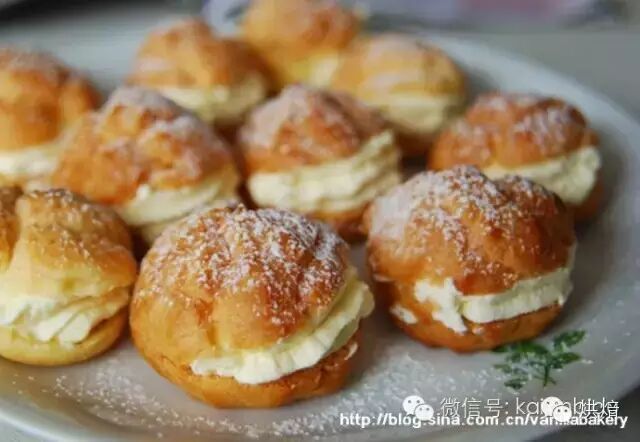涼透後,在側面橫切一刀開半,不用切斷。中間放入適量打發的鮮奶油,上面撒上糖份