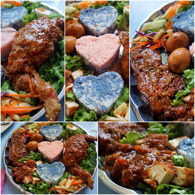 蓝花饭上桌时看到那惊人的分量我只能脱口而出说了这句话:“Oh My God...”~ 虽然知道是 sharing platter 适合 3至4 人一起享用,但是真的好大一份啊!!!!三个爱心蓝花饭配上两只全鸡腿以及卤味三层肉,另有辣味豆干、卤肉、卤蛋、咸蛋、凤梨以及蔬菜等等,光是视觉上就很震撼了~ 如果没错的话蓝花饭的配料是会更换的,除了招牌炸鸡腿是固定菜肴以外,其他都是店主自行决定,在他们的脸书专页还有看到辣辣虾和鱼肉之类的菜肴。