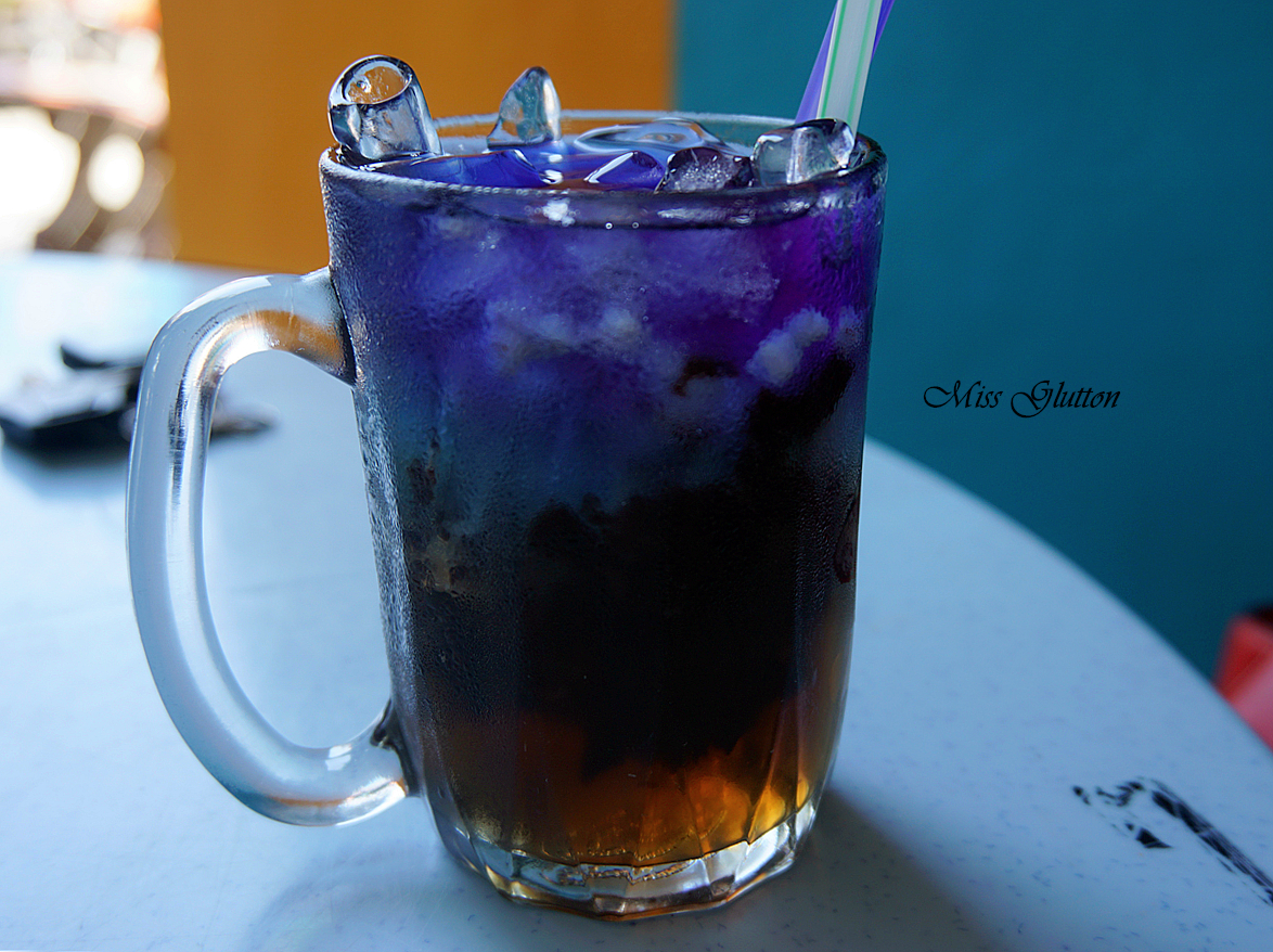 在我们点完餐后饮料很快就送上来咯,加入兰花泡成饮料的蓝花薏米 & 凉粉蓝花光是在视觉上就很出众了!特别的三层颜色分别是兰花水、薏米 & 蜂蜜,搅拌在一起后喝起来有一种淡淡清甜感,在这个炎热的天气喝了可消暑啊,老妈也说好好喝~