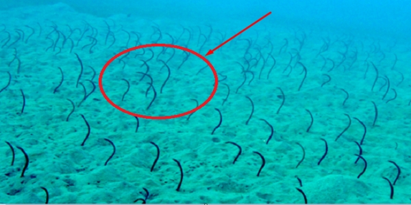 Griffith跟隨潛水教練練習潛水時,在海底看到這樣的壯觀嚇人場面,直叫人頭皮發麻。遠遠看去,密密麻麻的一片,不知是些什麼物體,只見牠們露出來的一截隨著海流不停地晃動著,看起來非常像蛇,難不成這是一個「海底蛇窩」?