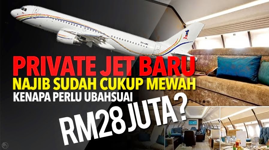 SETIAUSAHA Agung KEADILAN, Saudara Rafizi Ramli hari ini dilapor mempersoalkan kerajaan Malaysia di bawah pimpinan Perdana Menteri Najib Tun Razak yang telah menghabiskan RM28 juta untuk menghias 'private jet' berharga RM456 juta.Menurut Rafizi Ramli, jet peribadi mewah model ACJ320 yang dibeli khas untuk kegunaan Perdana Menteri itu sudah cukup mewah dan cantik kerana itu beliau mempersoalkan kewajaran Najib menghabiskan RM28 juta untuk menghias dan menaik taraf ruang kabinnya.