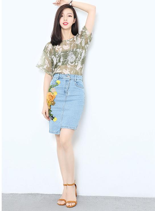 5.透明印花套裝 T恤+半裙 印花雪紡衫,散發了十足的女人味,為夏天注入絲絲甜美和活力。輕薄的雪紡輕盈透氣,若隱若現,甜美又不失性感。浪漫唯美的花朵印花,給人清爽宜人的感覺,搭配一條繡花牛仔短裙,很襯顯氣質。
