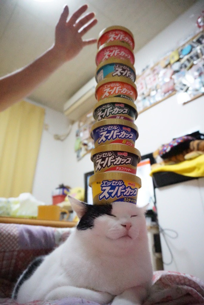 不過當然啦,這位網友「福助先生」(ミスター福助)是很愛家裡喵皇的。他在分享照片的時候就說了,冰淇淋其實都是洗乾淨的空盒,所以幾乎沒有重量。如果貓咪途中出現不喜歡的樣子,也會馬上停止。最重要的是,拍完照之後一定要劈哩啪啦地(?)大力稱讚貓咪、用點心收買牠的心XD。