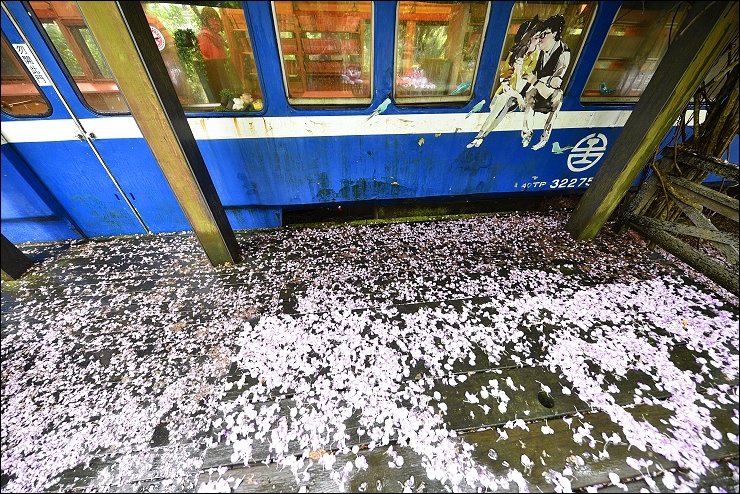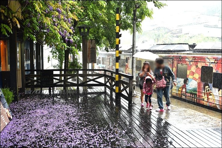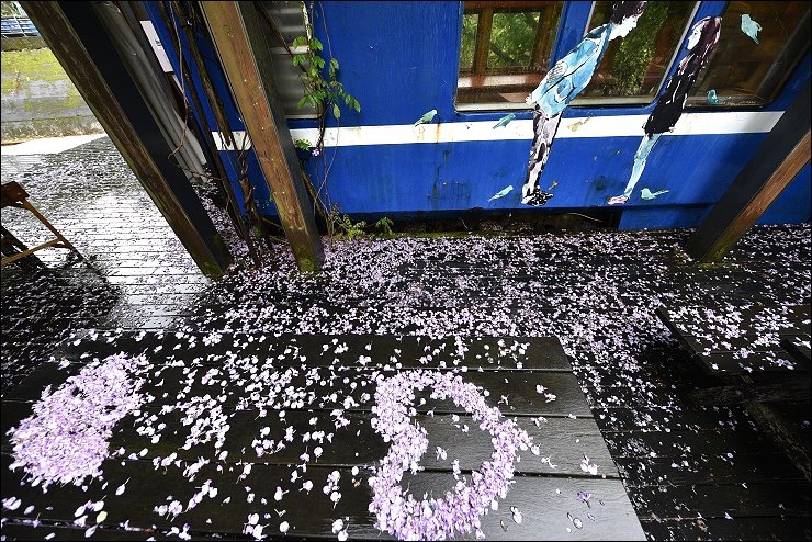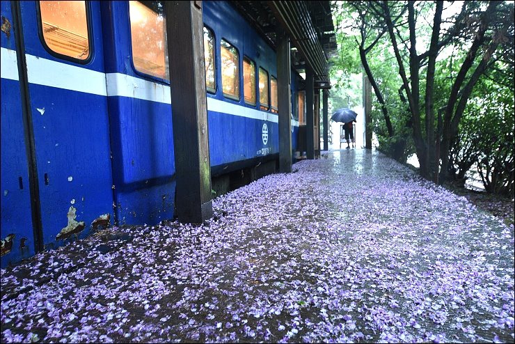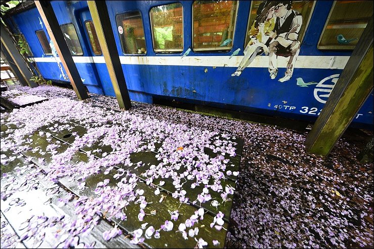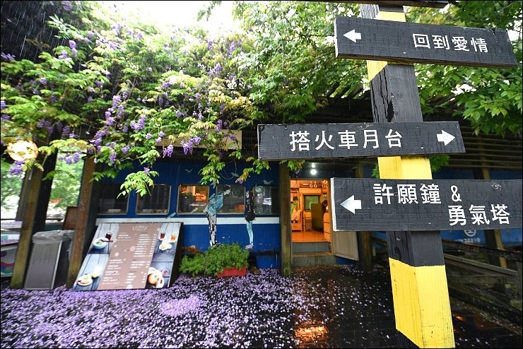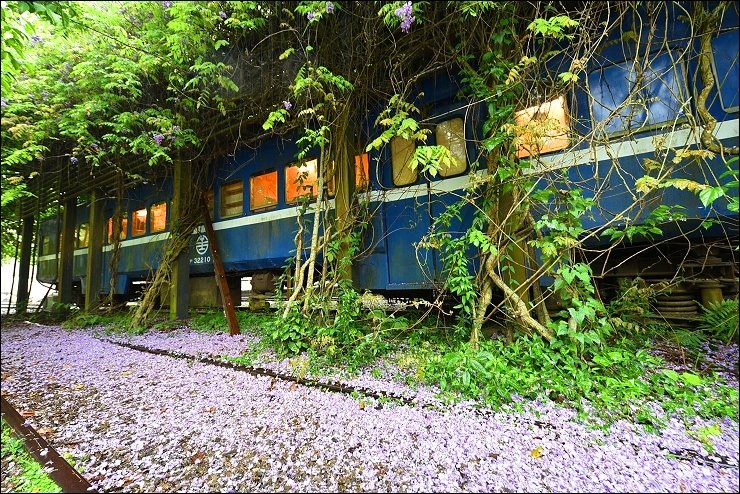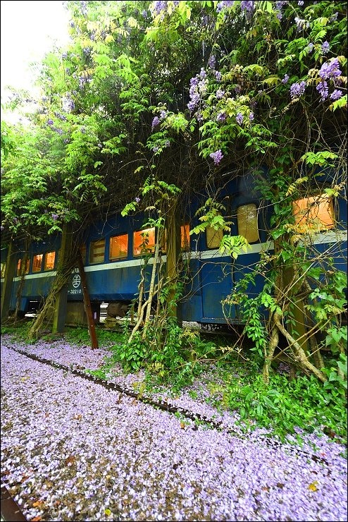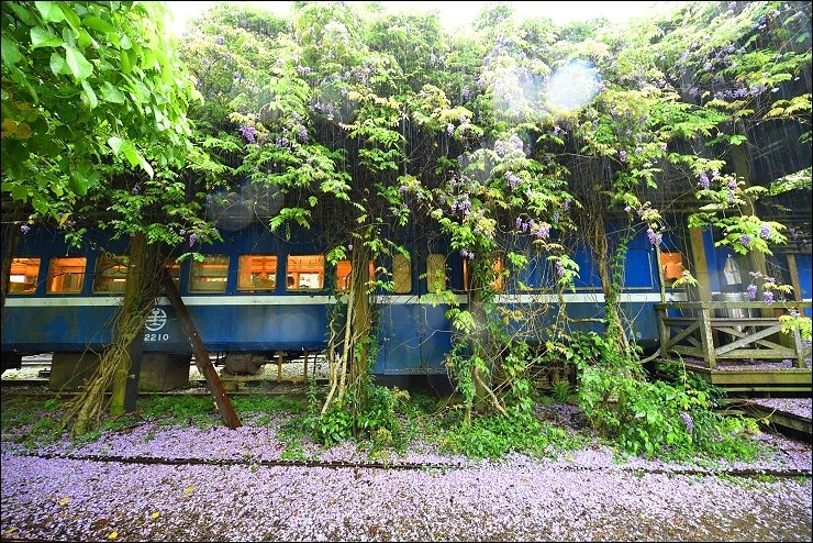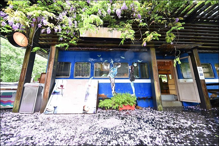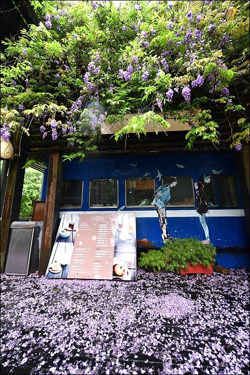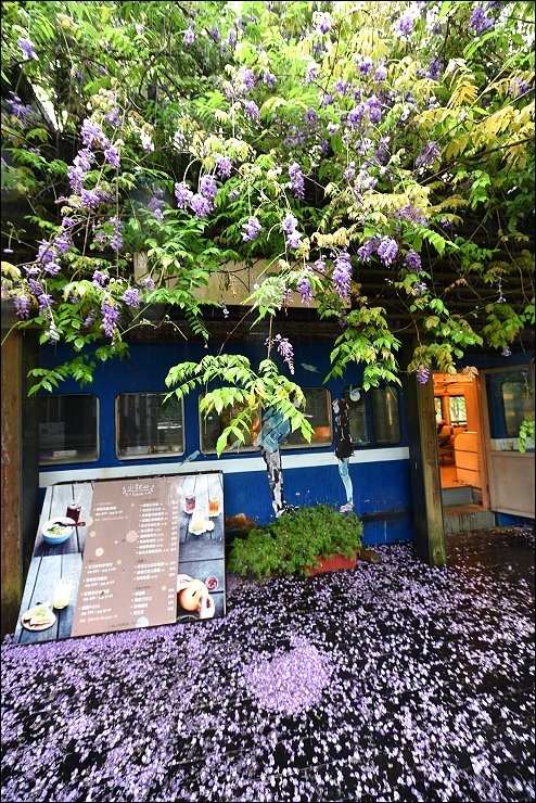 老火車廂改造而成的咖啡廳前前後後都舖滿了紫藤花毯,感覺就是要宣告五月油桐花雪的來臨!