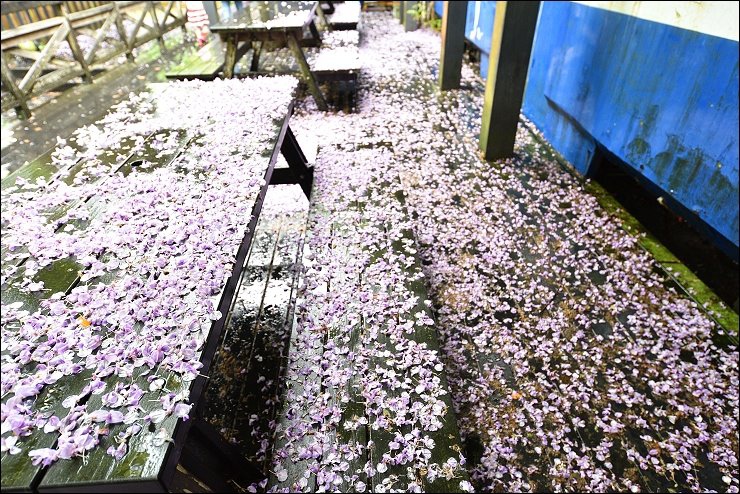 才剛下完大雨連桌子椅子滿佈紫藤花毯,當場打亂了台灣紫藤流瀑景點的排名,絕對有前三名的實力啊~~~