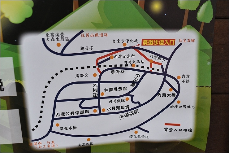 之前我們家來內灣看過二次螢火蟲,下面提供經驗和路線給大家參考:出內灣車站左轉過火車城堡造型的地下道,走內灣國小旁邊階梯向上(大象溜滑梯旁邊),就在賞螢民宿上方,內灣東窩星海星海賞螢區入口有人員管制,雖然螢火蟲密度沒像東勢林場那麼高,但整條路都可見點點螢光,還不時飛舞到馬路中間。