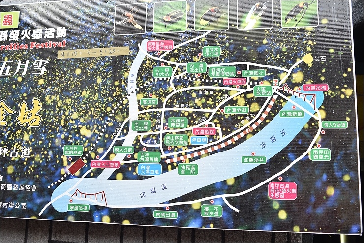 內灣老街附近的賞螢點在東窩溪星海,距離內灣車站只要十分鐘腳程就有螢火蟲在身邊飛舞啦!