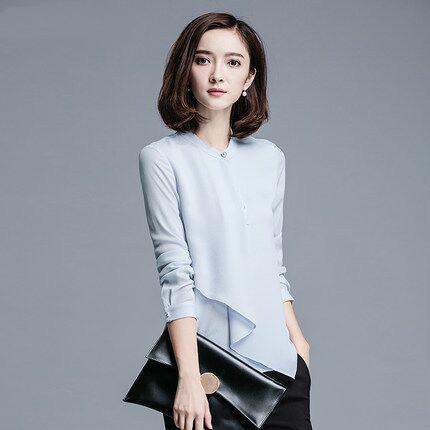 簡潔的領口,讓鎖骨微露散發小性感,不規則的下擺設計,時尚休閒,珍珠扣子,晶瑩剔透,優雅顯氣質。