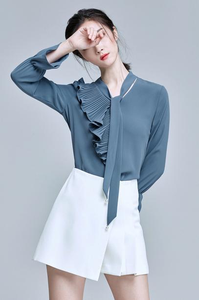 精緻的歐根紗絲帶,點亮設計,演繹輕奢質感,經典的開襟,簡約得體,與職場幹練相益得彰,充滿裁剪心思的百褶袖口,透露著淑女風範的訊息。