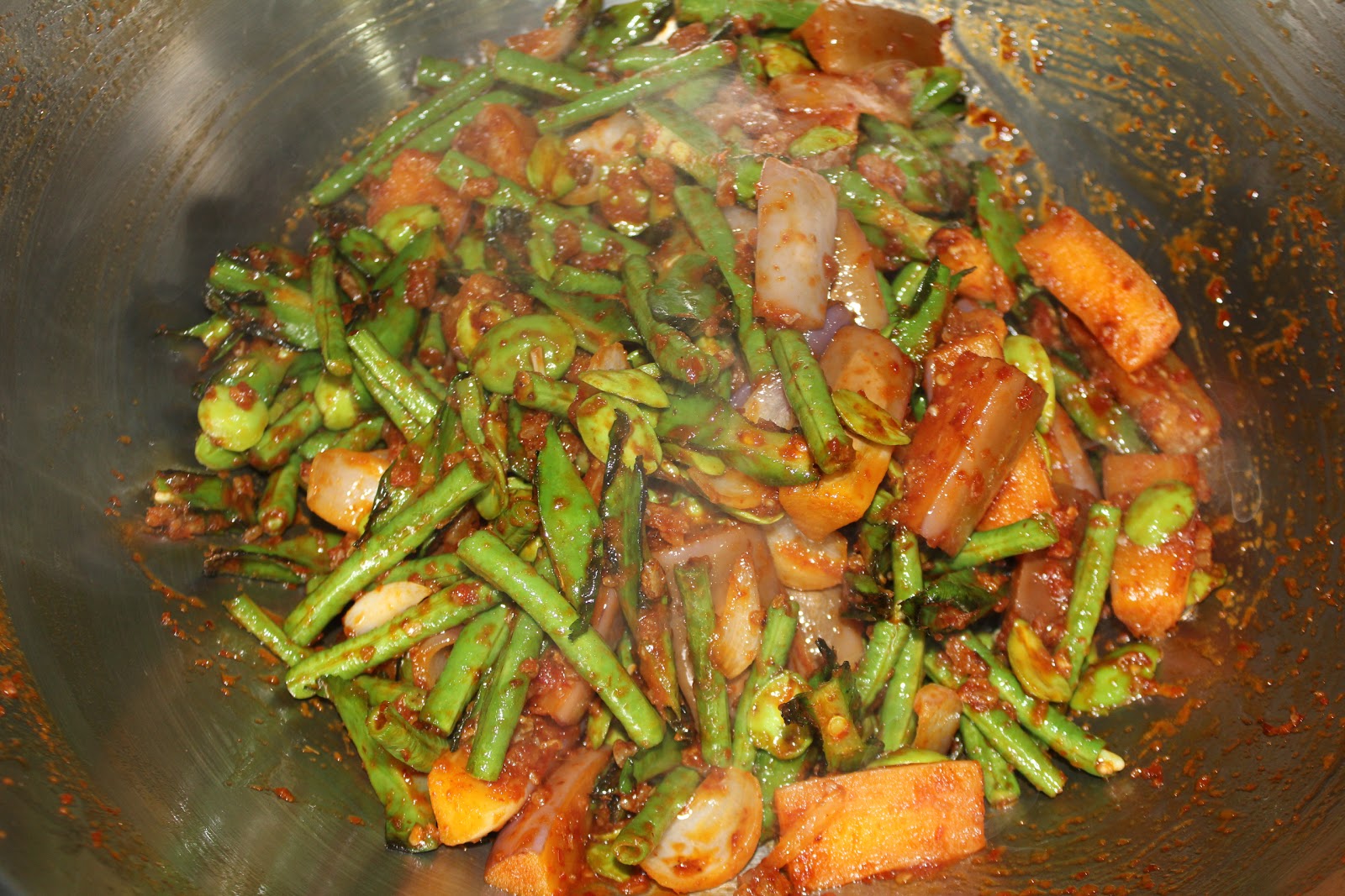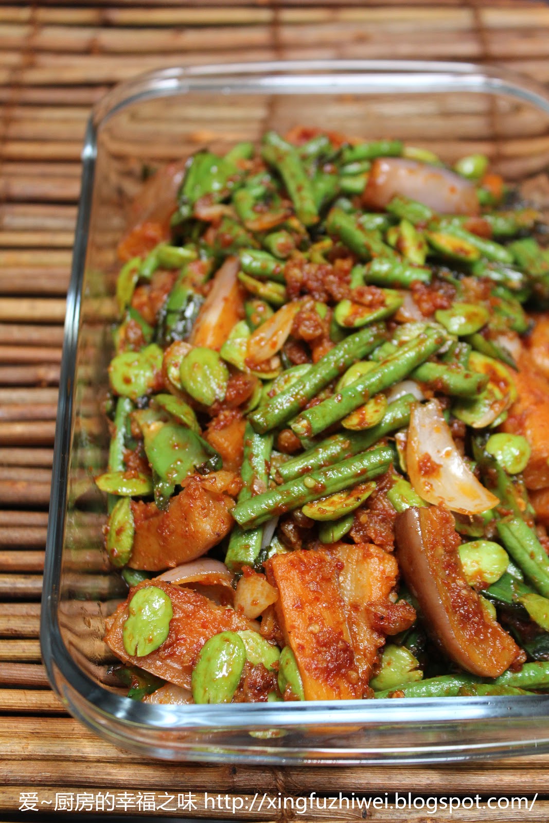 臭豆,長豆,四邊豆,紫茄,大蔥(先過油,就不需炒很久)