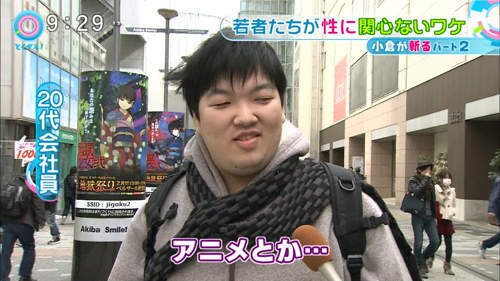 如果只是在攝影棚討論也就罷了,偏偏節目竟然直接跑到秋葉原週邊,直接詢問路人「最近有沒有做愛?」引發網路上熱烈議論……但是,多虧節目的認真探究,以及不怕公開承認自己是處男的人們接受訪問,總算統整出三大絕食的原因: