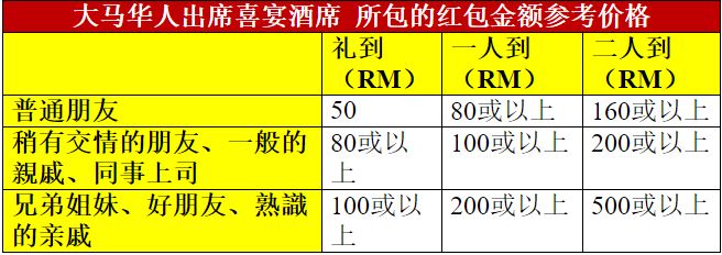 大都市的酒席花費:普通檔次(RM700或以上)中等檔次(RM800 - 1000)高級檔次(RM1200 - 1300)小城鎮的酒席花費:普通檔次(RM450或以上)中等檔次(RM800 - 950)高級檔次(RM1000)而每逢從年底至農歷新年期間,相信各位將會收到很多喜帖。那麼去到別人婚禮時,應該要給多少的紅包才算是比較合理的呢?在此帶給你馬來西亞華人出席婚宴時,所謂的紅包行情。一般民眾出席婚宴的類別被分為“普通朋友”、“稍有交情的朋友、一般的親戚、同事上司”和“兄弟姐妹、好朋友、熟識的親戚”3個級別,最後將再視乎宴請場地,決定所包的紅包金額。