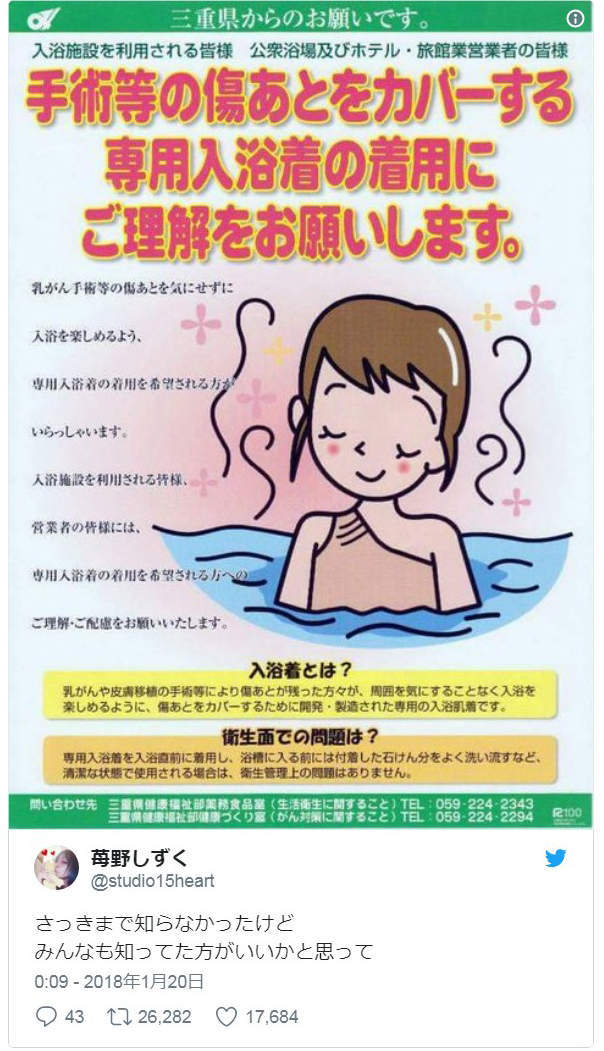 這真的該被好好宣導才對!也可以避免因為不知情而誤會的狀況。相信大家都知道日本泡溫泉洗乾淨後裸體進浴池是基本禮儀,但對於身上有因為乳癌等手術傷疤的人來說,這需要脫光光的溫泉也可能成為必須犧牲的樂趣,除非有顆完全不會在意別人眼光的強心臟,不然應該也很難再有踏進澡堂裡的勇氣吧...但其實日本有推出這麼一款專門遮蓋傷疤用的「入浴衣(入浴着)」卻因為意外不為人知而最近在推特上引發話題後引起注意......
