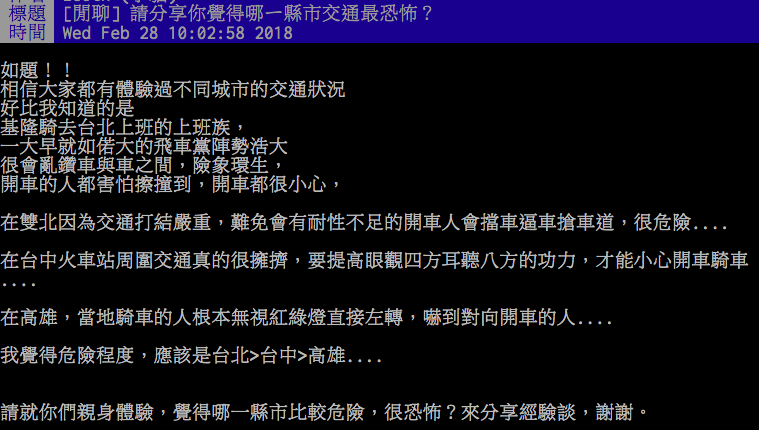 ▼2月28日,有網友在PTT上邀請大家討論:「請分享你覺得哪一縣市交通最恐怖?」,原PO認為危險程度應是台北>台中>高雄,沒想到票選結果竟是另一城市當選…