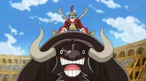 曾经残暴的斗牛,如今一副可爱的样子,也令人印象深刻!后来被海尔汀踩压,让路飞大怒,让观众可惜!不仅如此,后来也带路飞冲上多弗郎明哥老巢,被明哥分身重创!它为了路飞而两次倒地!看的简直揪心!