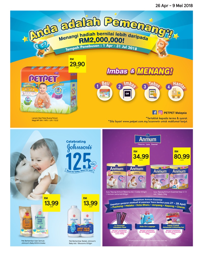Tesco在每個星期四都會推出一個為期兩周的促銷活動!Tesco最新的促銷活動從4月26日開始至5月9日在全馬的 Tesco 同步舉行。在此次促銷活動中,2kg Milo RM29.99、5kg 紅鷹油RM22.99、各種嬰兒尿片、嬰兒奶粉、各種新鮮蔬果、各種日常所需都有促銷。大家可以先參考Tesco所推出的促銷宣傳單,這樣能讓你進行貨比三家,讓你節省不少開支呢。