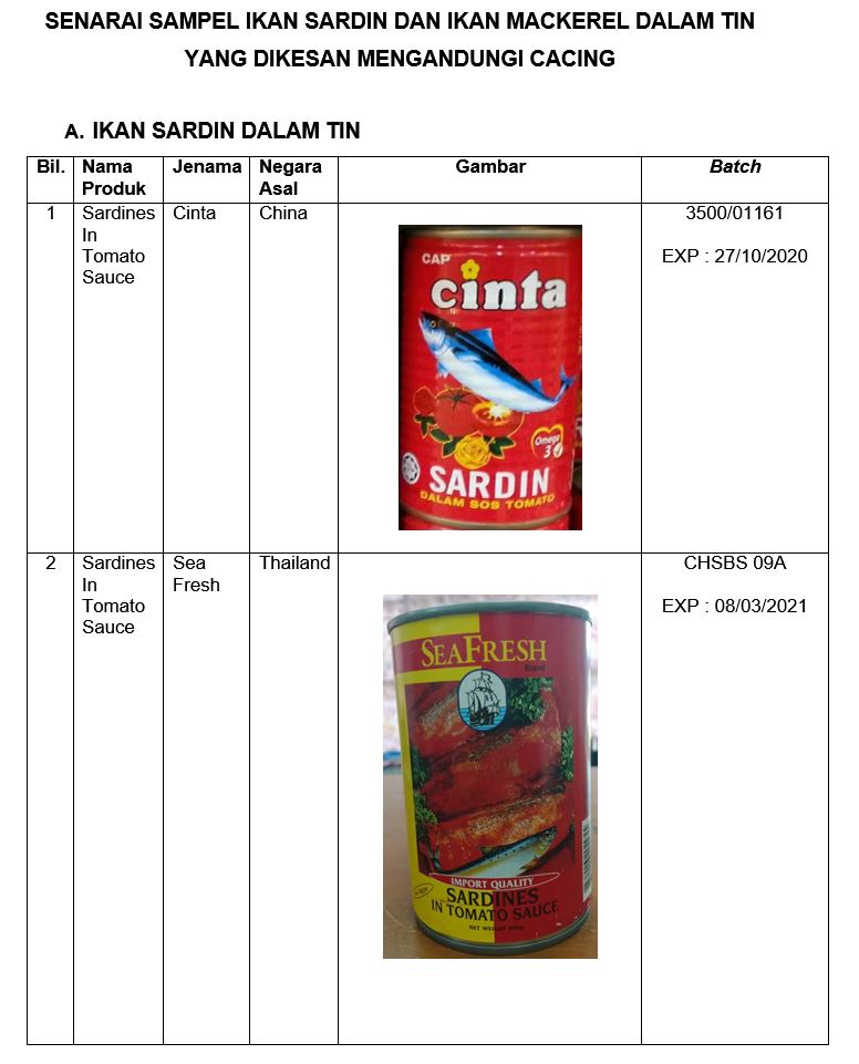 除了2款早前已發現有蠕蟲,分別是TL Tan Lung和TLC的沙丁魚罐頭品牌外,衛生部指出,另有數個牌子的沙丁魚罐頭也驗出有蠕蟲。衛生部證實,在最新的檢驗中發現,Cinta、Sea Fresh和HS,3家由中國進口的沙丁魚罐頭中發現蠕蟲。