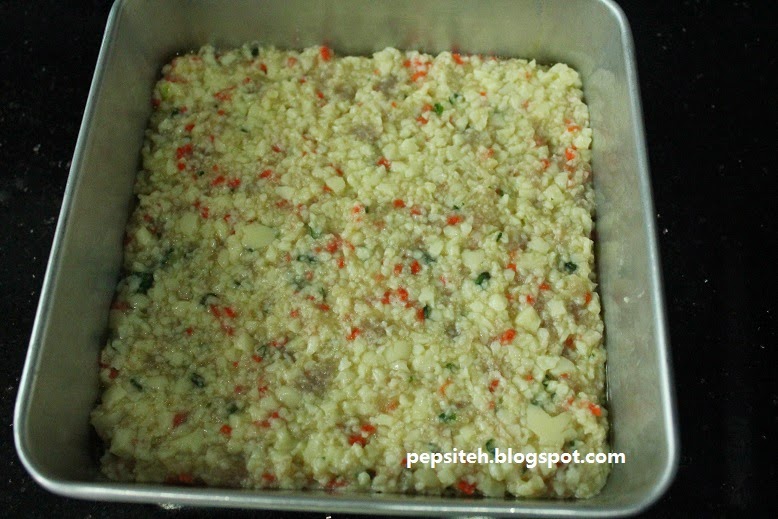 2. 8”的四方模型盤裡抹上一層油,將步驟(1)的豆腐泥倒進盤裡。