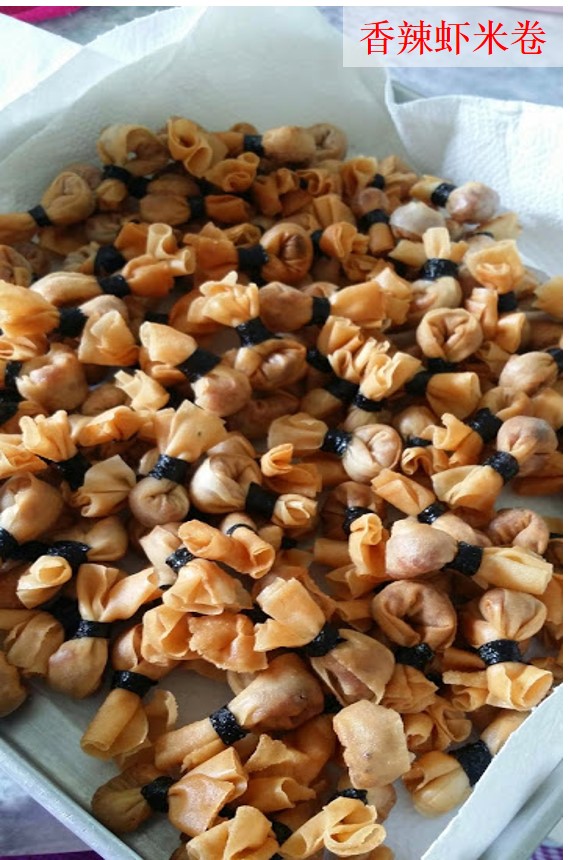 4. 鍋內倒入食油燒熱,將蝦米卷炸至金黃色即可。
