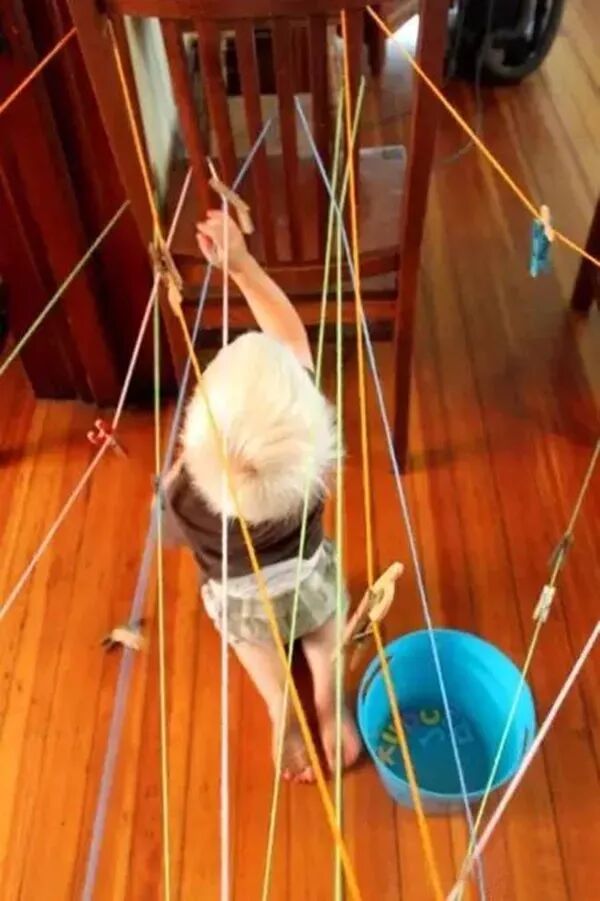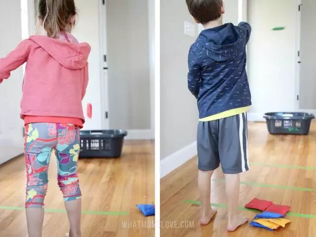 把家里的盆子拿出来,贴上分数值,跟孩子比赛扔沙包,看谁得分更高!扔沙包,套圈圈