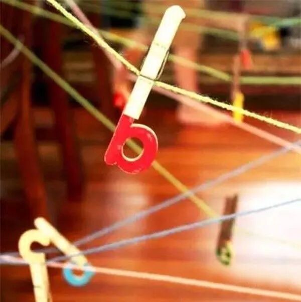 将夹有26个英文字母的夹子随机夹在绳子上。