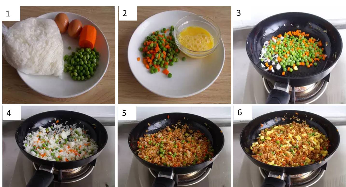 材料: 隔夜米飯,胡蘿卜,豌豆,雞蛋,豬油,醬油,鹽,胡椒粉