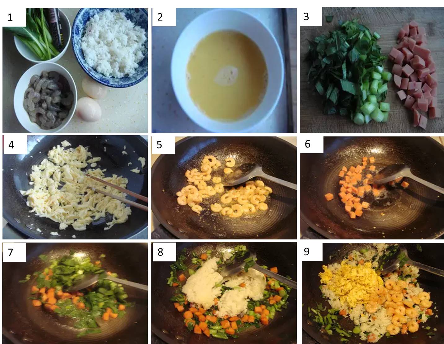 材料: 隔夜米飯,雞蛋,青豆,胡蘿卜,香蔥,火腿腸,鹽,雞精,白鬍椒粉,生抽,香油
