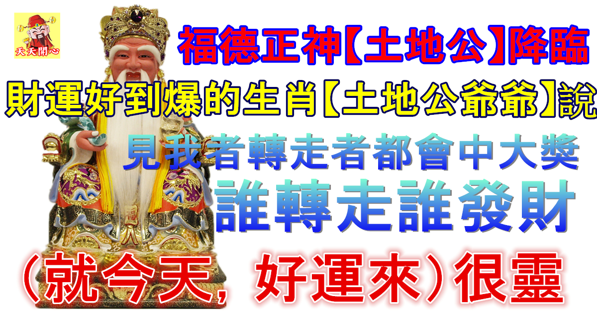 每個人都曾經求神拜佛,可是你知道哪些神佛可以保佑你大發橫財嗎?今天是個特殊的日子!大伯公降臨,財運好到不得了的生肖!18秒內轉走者都會沾上好財氣!大伯公說今晚會送財給轉走的人哦!如今,運氣也是一種實力,勤奮縱然重要,但運氣這玄乎的東西,少了半分,什麼事都辦不成。還好,運氣這東西,不像太陽東升西落那樣定死了,就算你今天倒黴透頂,可能明天就財運滾滾來。