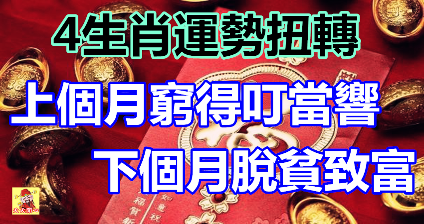 運勢無時無刻都在變化,有高潮,也就會有低谷,雖說“人定勝天”,但心裡要清楚“越努力越幸運”的道理,只要堅持努力,哪怕之前的日子再窮,以後也能讓他人仰望自己的富貴,逆風翻盤,讓曾經瞧不起自己的人刮目相看。下面我們就來看看,上個月窮得叮當響,下個月脫貧致富,哪4生肖運勢扭轉,好運加身,搖身變有錢人,幸運得不得了吧!