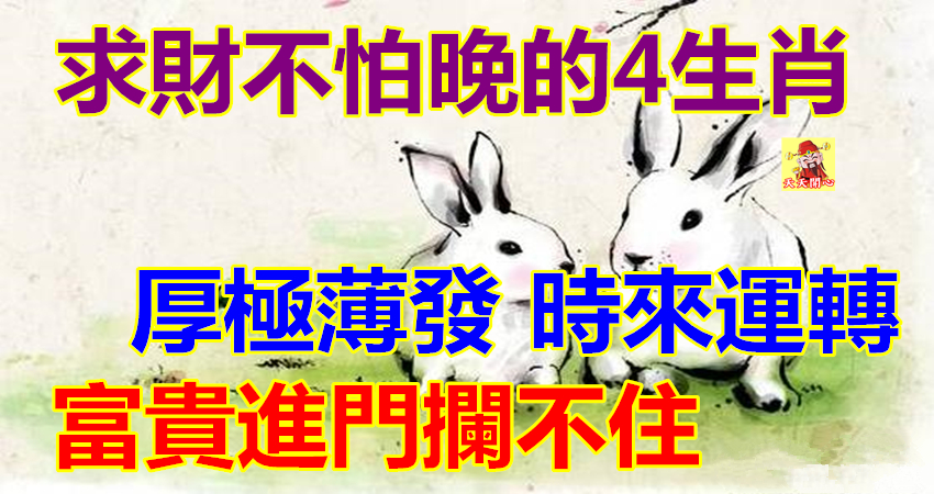 從性格方面來看,生肖兔為人善良、性格溫順,不喜歡與他人爭搶;在平時的工作和生活中,只在乎自己開不開心,過得好不好。雖說早年日子平淡,過得不差,但財運方面似乎差了點什麼;不過隨著他們年紀的增長,歲數越大,命運越好,財運一觸即發,中年發跡,迎來大吉大利的好運程。