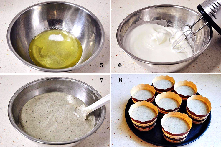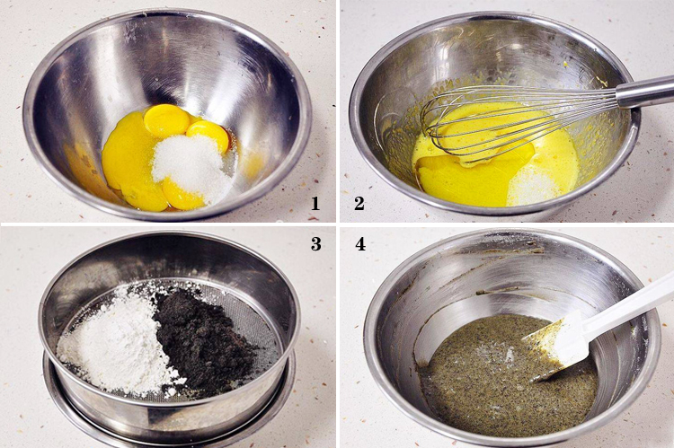 食材:雞蛋4個(清和黃分開用),白砂糖、橄欖油、牛奶50克、低筋麵粉40克、黑芝麻糊粉35克