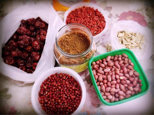 1.紅衣花生,紅棗,紅豆,枸杞子及紅糖,每種抓一點。紅豆需洗淨提前2小時浸泡,因為紅豆是洗乾淨再泡的,泡紅豆的水也不要掉倒,可以用來煮湯。