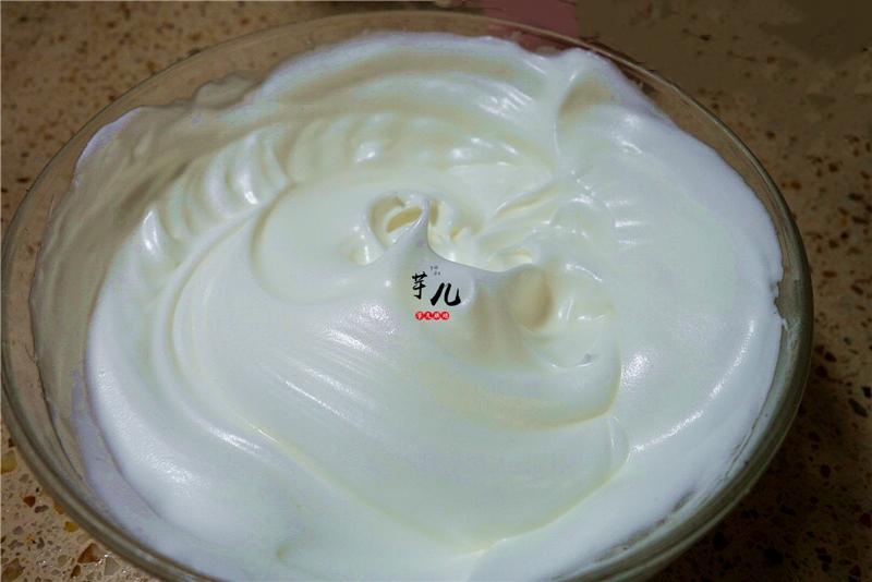 4.蛋清裡面加幾滴白醋,分三次加入細砂糖攪打至濕性發泡。提起打蛋器成彎鉤的狀態,就行了。