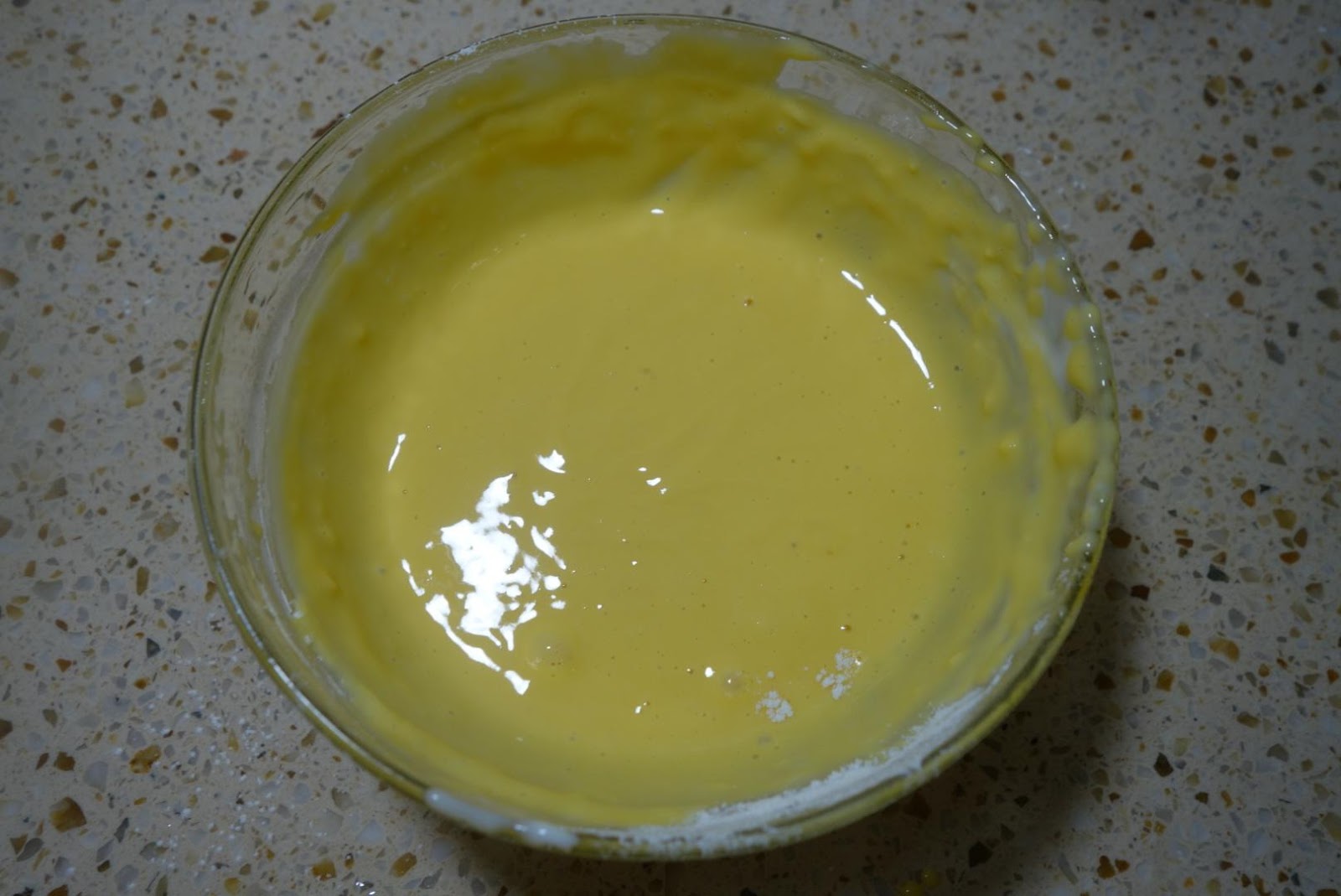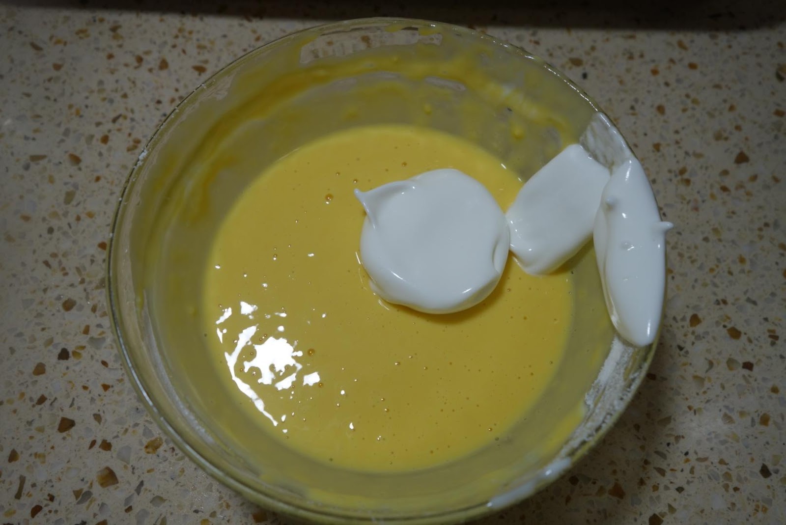 5.取三分之一的蛋白霜到麵糊裡,翻拌均勻。切忌劃圈。