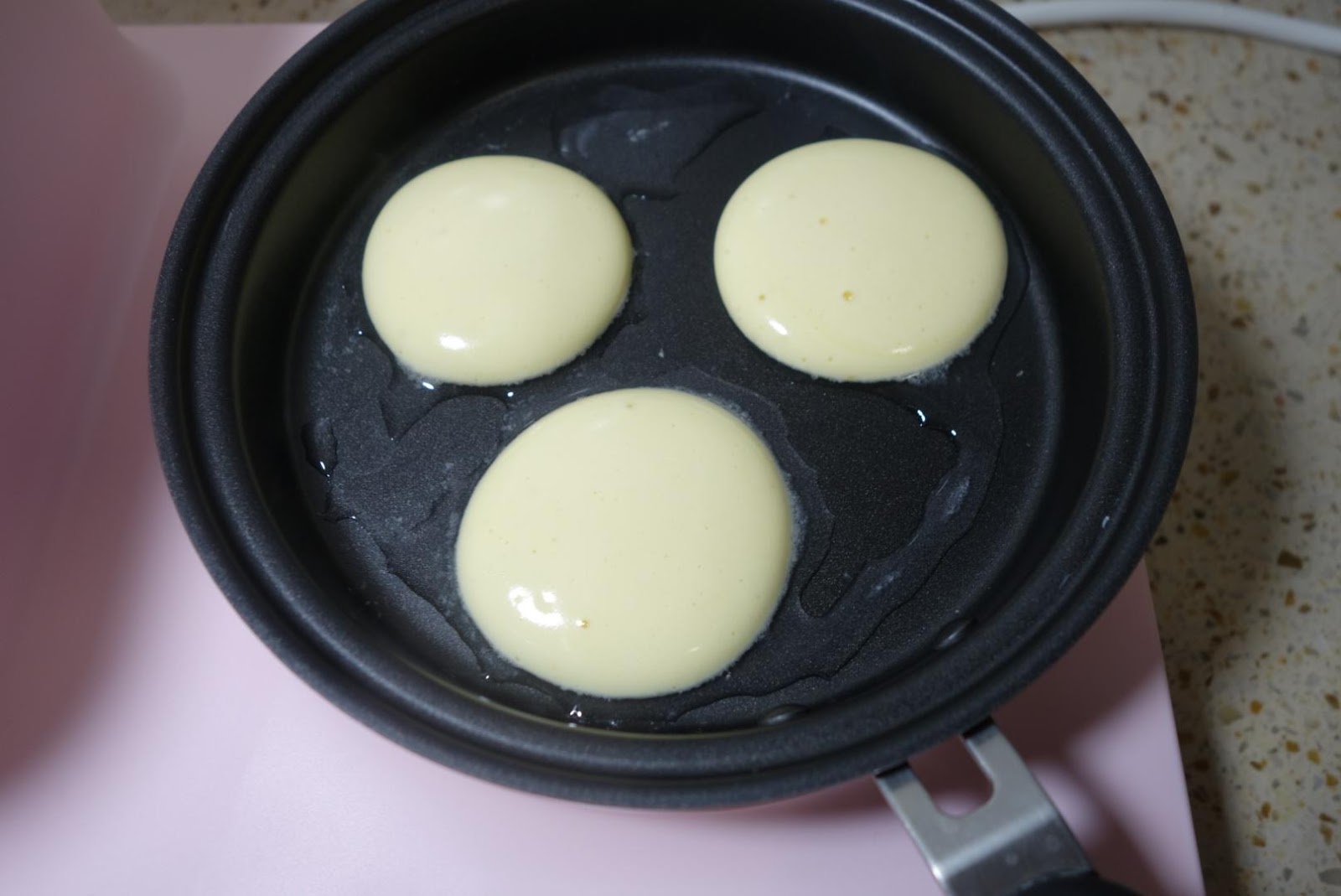 8.將拌好的麵糊用勺子舀到早餐機平底煎盤上。然後沿蛋糕的周邊加入兩小勺清水