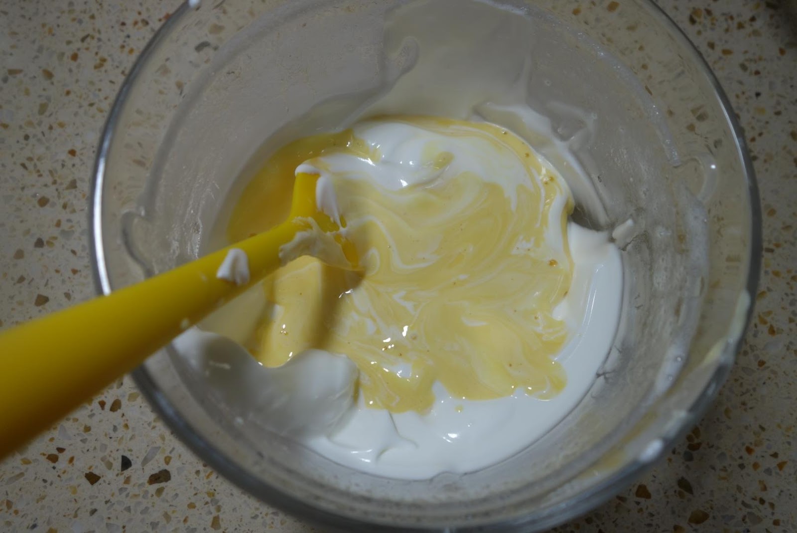 1.將雞蛋分離在兩個無水無油的干淨碗裡。蛋黃中加入酸奶攪拌均勻。