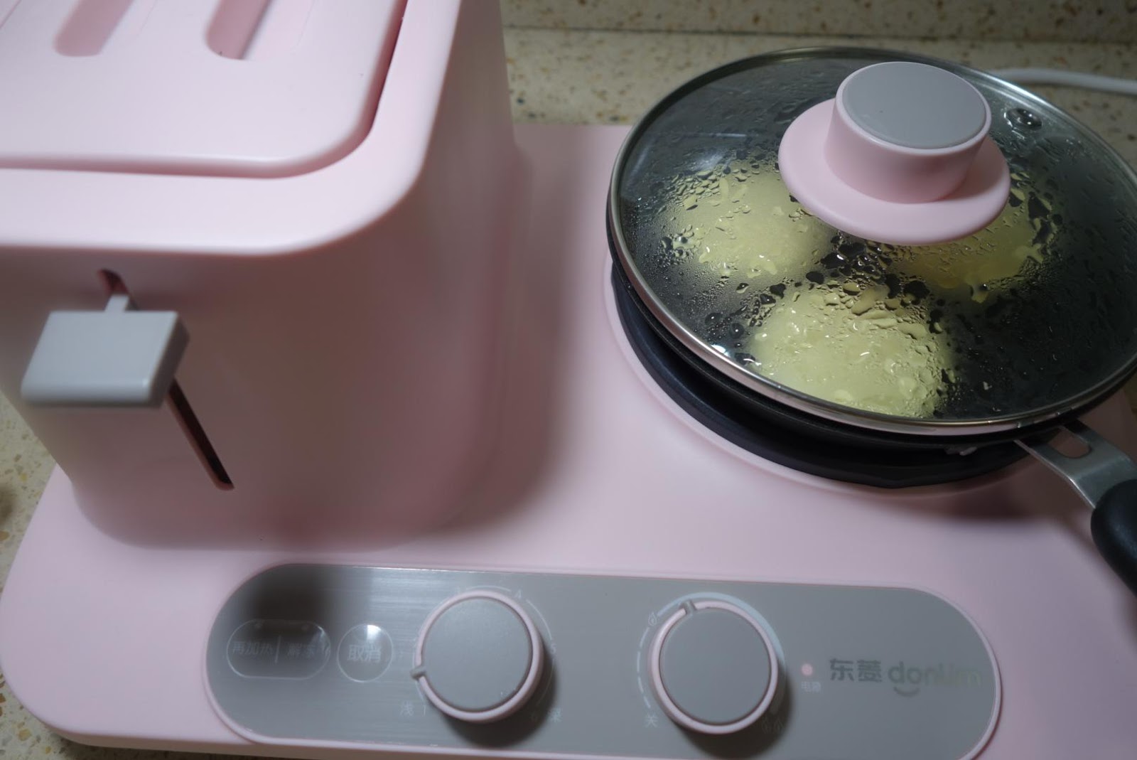 7.取來早餐機,插上電源,將開關打開,低檔將煎盤預熱5分鐘。抹上一成色拉油,燒熱。