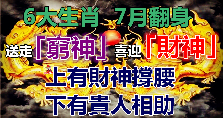 生肖龍的人,無論男女都是有財氣的人,有氣場卻不高傲,性格十分冷靜樂觀,心裡裝不下太多煩惱,只知默不作聲的暗自努力,事業場上足以一鳴驚人,五行屬土的他們在各路財神的相助之下,7月開局就有喜事,窮神趕出門,財神請進門,驚喜連連在事業,不僅升職早,發財快,屬龍人更能遇到不少貴人的傾力相助,自此家財有餘,錢財不缺,生意越做越大,鈔票一分不缺!富貴人生就此開始。