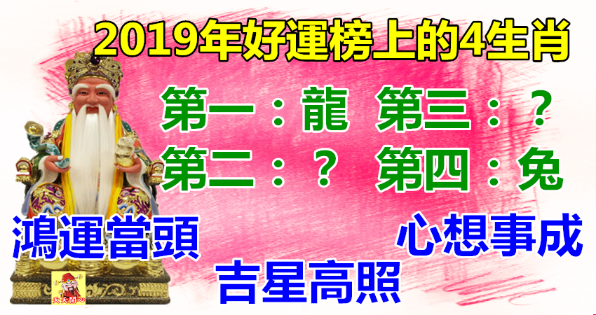 進入新的一年後運勢也會發生變化,這變化讓有些生肖得到好運、有些生肖得到好財,那麼今天我們先來說一下在好運榜上的前4名生肖朋友,他們2019年鴻運當頭,吉星高照,心想事成。來看下好運榜前四名有你嗎?