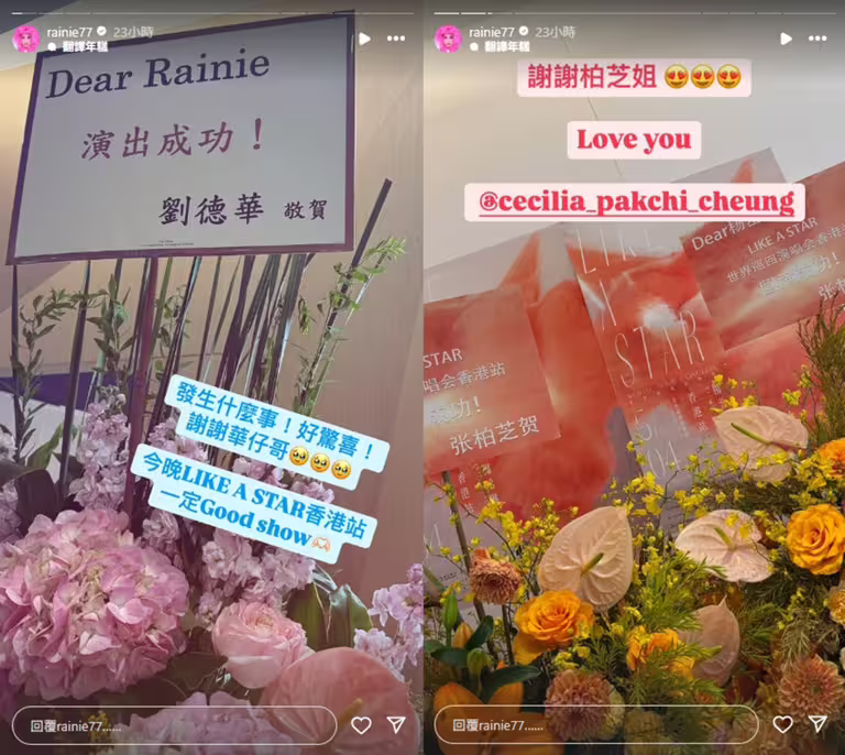 除了劉德華以外,女星張柏芝、容祖兒、Twins蔡卓妍和鍾欣潼、王祖藍和李亞男夫妻都有送上花籃祝賀。除了藝人朋友外,楊丞琳也曬出20幾年前擔任她的唱片宣傳所送的花籃,並透露:「從工作夥伴變朋友,回到你們的主場演出,有你們在我很安心」。