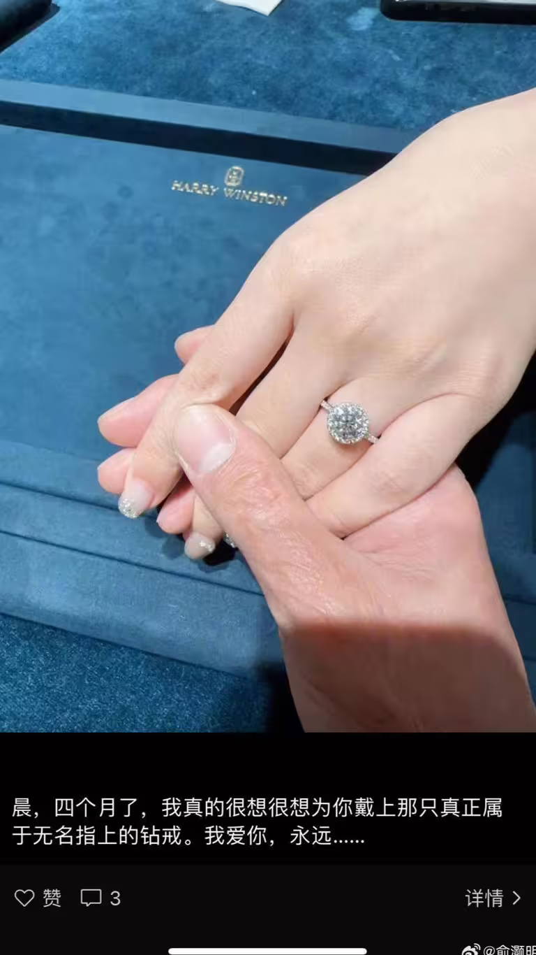 俞灝明今清晨發文告白,寫下:「在感情裡,我後悔過去的所有。現在才明白,我只愛過一個人,直到你的出現,讓我覺得過去承受的一切傷痛都值得!」認愛神祕女子,而從他的照片截圖可見,他親暱稱對方「晨」,深情喊話「四個月了,我真的很想很想為你戴上那只真正屬於無名指上的鑽戒。我愛你,永遠......。」