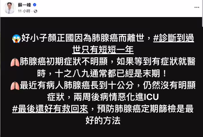 關於肺腺癌,胸腔科醫師蘇一峰也在臉書發文,呼籲民眾應多留意身體狀況。