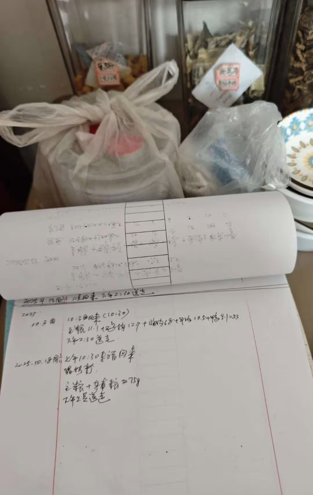 用空白廢紙裝訂成冊的日記上,清楚登記日期和來福每天的飲食狀況,一天兩餐吃哪些肉、蛋和蔬菜,甚至連每種食物的克數都計到小數點,非常注意狗狗的營養均衡。讓孫女開玩笑懷疑:「感覺吃得比我好,怎麼回事?」