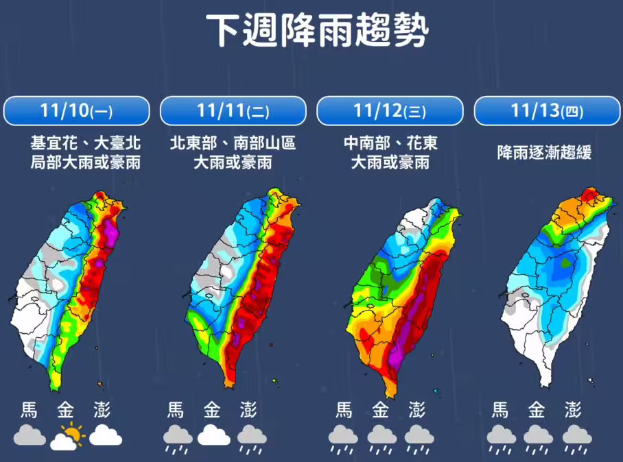 《台灣颱風論壇|天氣特急》指出,北部東部最快明晚到週一 (9、10) 就會開始下雨,又碰上東北季風增強,迎風面受共伴效應發威,北部東部「將會出現持續性的劇烈降雨」。雖然颱風預估從西南方撲台,「仍不可輕忽共伴、迎風面造成的劇烈降雨威脅,週一、二 (10、11) 風險最高。」