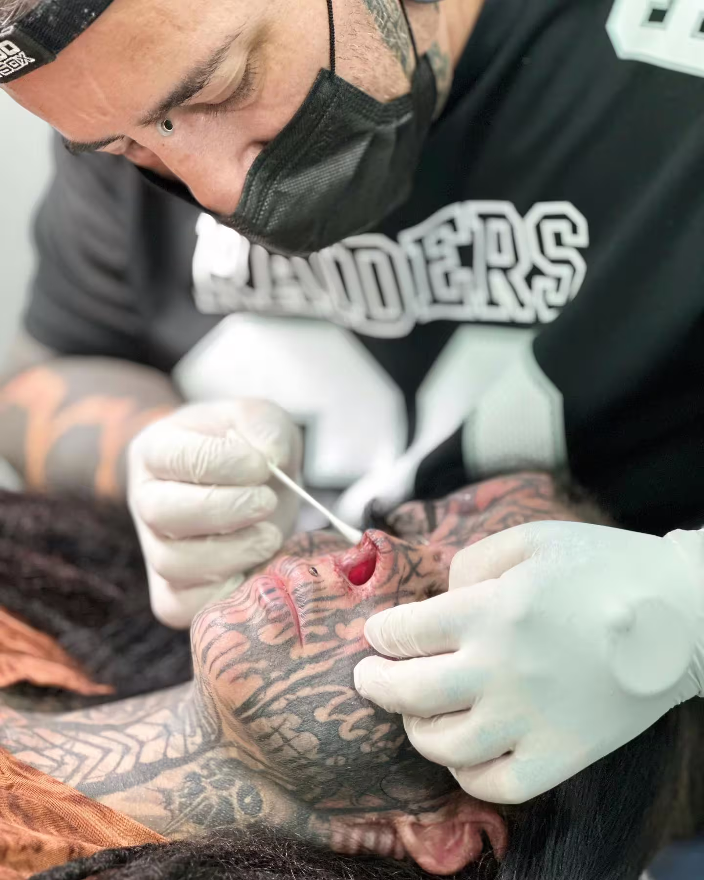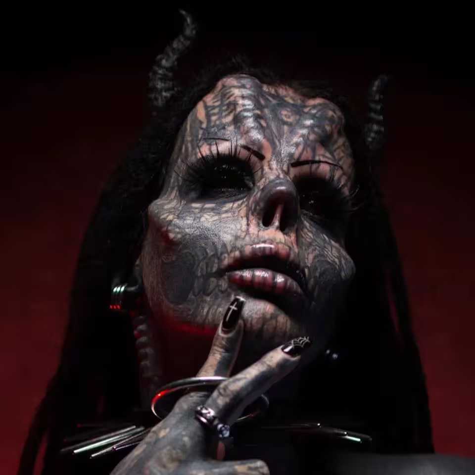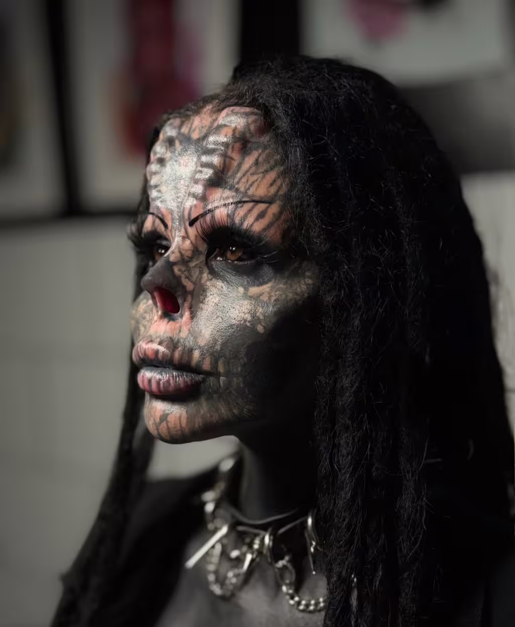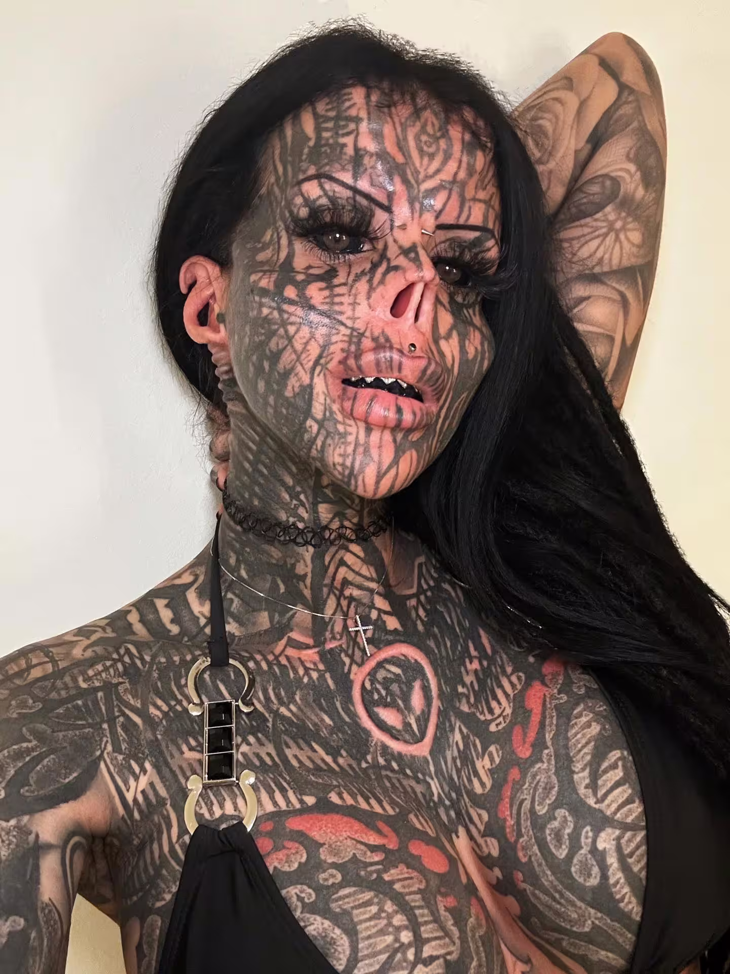 因為她不僅從頭到腳的皮膚都被刺青覆蓋,身上還有各式各樣的穿孔和假體,包括切除鼻子、將舌頭分成兩半,以及在額頭上植入看起來像惡魔角的植入物。
