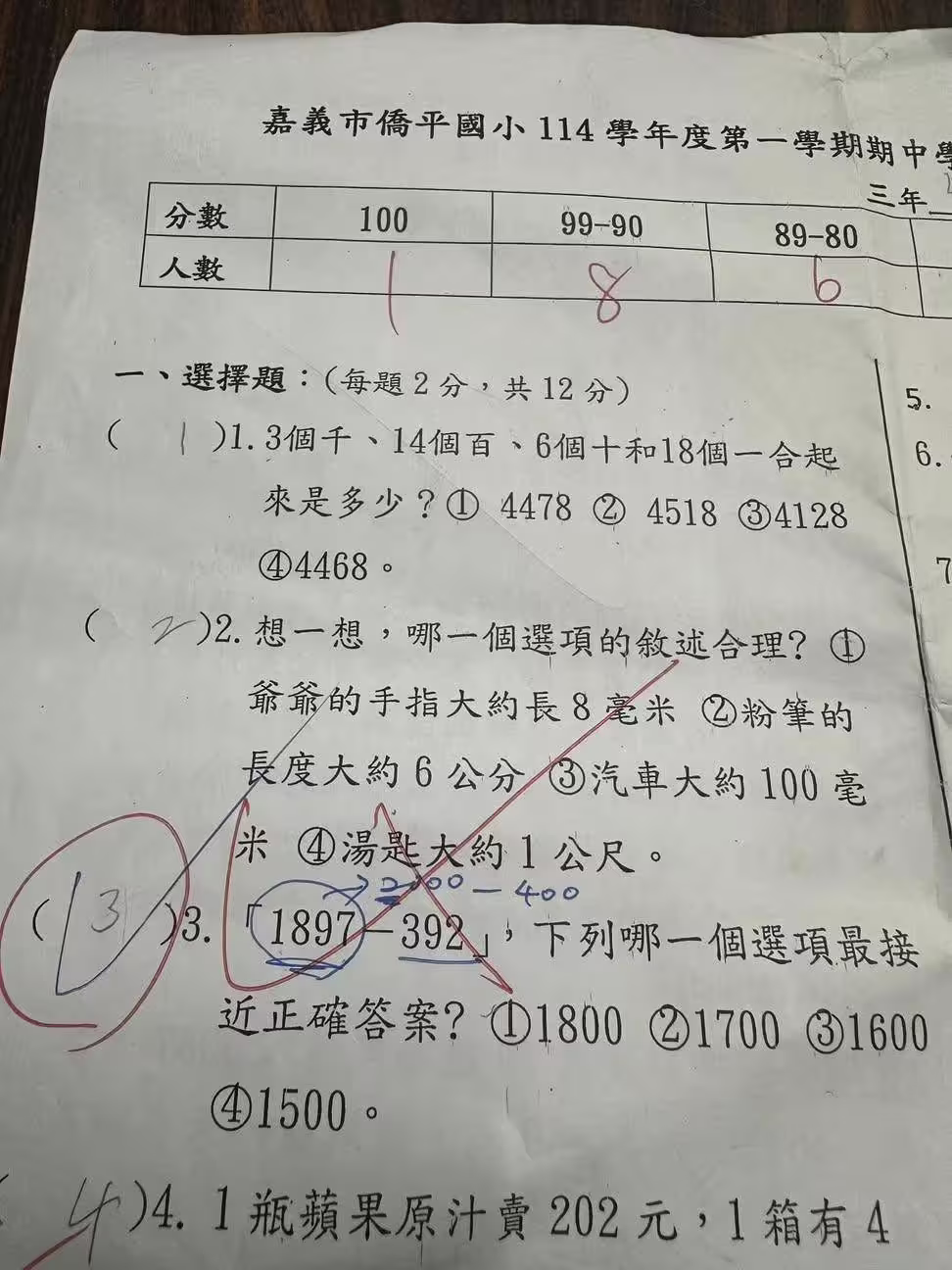 怎料老師解釋出題要考的觀念是「整千概念」,1897接近2000,因此堅持2000-400=1600,公布「1600」為才是正解。原PO指出題目只問哪個「最接近」正確答案,沒說要用大約來算,「怎麼可以四位數的估算到千位,三位數的估算到百位,然後再來合併計算呢?」既然選項裡有1500,就不該選1600,覺得題目本身就有瑕疵。