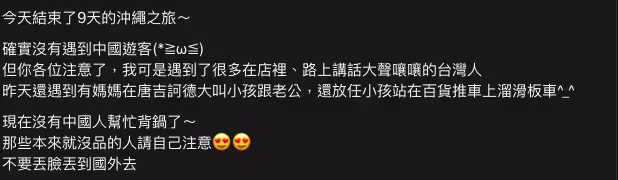 一名網友在Threads發文表示,9天的沖繩之旅確實沒有遇到中國遊客,「但你各位注意了!我可是遇到了很多在店裡、路上講話大聲嚷嚷的台灣人」,還遇到一位母親,在唐吉訶德大叫小孩跟丈夫,且放任孩子站在百貨推車上溜滑板車。