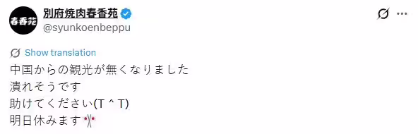 根據媒體《東森新聞》、《ETtoday新聞雲》的報導,日本大分縣別府市經營54年的「別府燒肉春香苑」近日在社群平台X上發文求助,「中國觀光客消失了,快撐不下去了,誰來幫幫我啊!明天我們店休一天!」