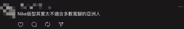 此外,也有人分析,Nike的版型不太適合所有群眾,「Nike真的寬腳不友善,現在都穿亞瑟士、NB、美津濃、Salomon,Adidas服飾還算不錯,鞋子就普通,無法久穿,Puma最近很努力出各種不同顏色的賽車鞋,滿可愛的」、「NB的鞋子好穿機能也好,反觀Nike就是在賣那幾款,但有時沒有很好穿」、「Nike版型其實太不適合多數寬腳的亞洲人」。