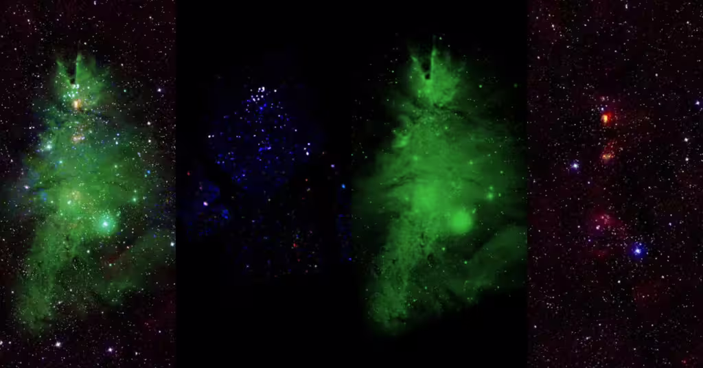 從畫面中可以看到,藍白色亮點代表年輕恆星所釋放的強烈X光輻射,這些恆星因磁場活動旺盛,會在X射線波段產生明顯光芒,看起來就像掛在聖誕樹上的閃爍燈飾,大面積的綠色雲霧則來自可見光望遠鏡所拍攝的星際氣體結構。